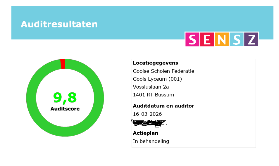 Bij de laatste voedselveiligheidscheck (audit) door Sensz scoorde onze kantine een 9,8 Dat betekent dat de schoolkantine op het gebied van voedselveiligheid en de HACCP-richtlijnen uitmuntend presteert. Dit cijfer duidt op een zeer hoge mate van hygiëne, uitstekende naleving van protocollen en minimale risico’s op onregelmatigheden.